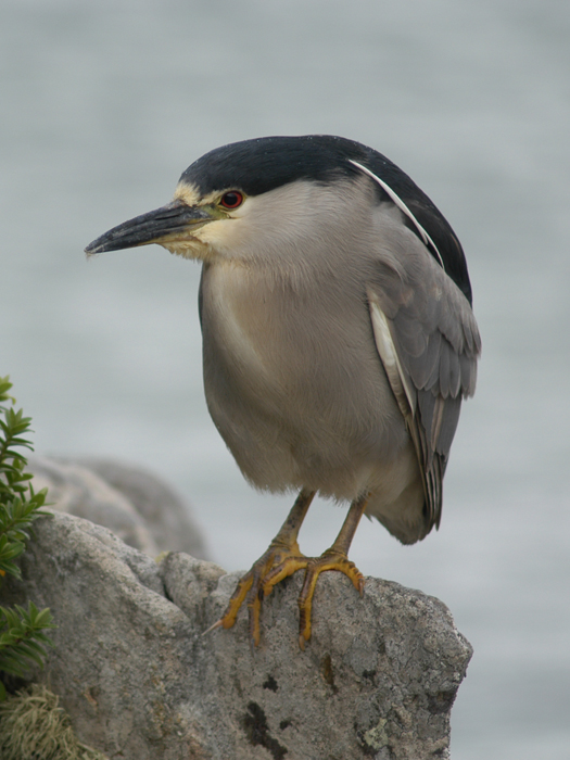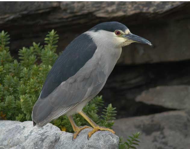 Falklands 'Quark'. Black-crowned Night Herons are easily recognised by their distinctive blue/ black heads with two long white plumes. They are resident breeders in the Falklands. Length: 36 - 38 cm (21 - 22 inches) Quarks are widely distributed along coasts where rock pools and coastal shallows allow it to take small fish, aquatic larvae and insects at low tides. They often breed in small colonies in company with rock shags on low cliffs where there are plants or a bit of tussac. They will breed in settlements in trees.