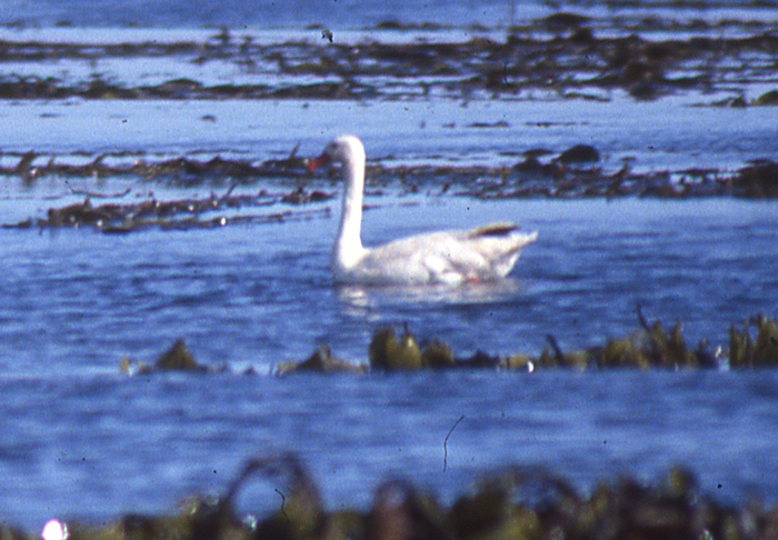 The Coscoroba swan is small and duck-like, length: 90-114 cm ( 36-45 inches), even resembling a domestic goose in the water. All white with only black tips to wings and bright pink/ red bill and legs. Orange eye.