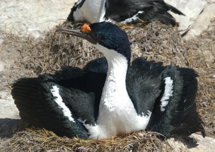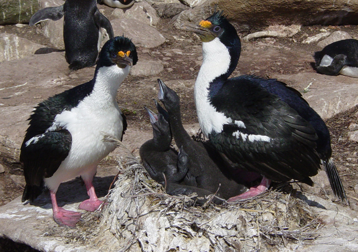King shags are Falkland common residents, Falklands 'King Shag' where they breed in crowded level cliff-top colonies, often alongside Rockhopper penguins, Black-browed albatross or Gentoo penguins. Length: 72cm (28 inches). They are easily separated from Rock Shags by their white chin extending to the breast, and blue eye-ring. King shags favour open waters, going further offshore than rock shags to around 12 km in the summer and 37 km from June to October, (White) where they forage in small flocks. Diet is fish and crustaceans by shallow diving, small fish generally being taken for chick-rearing.