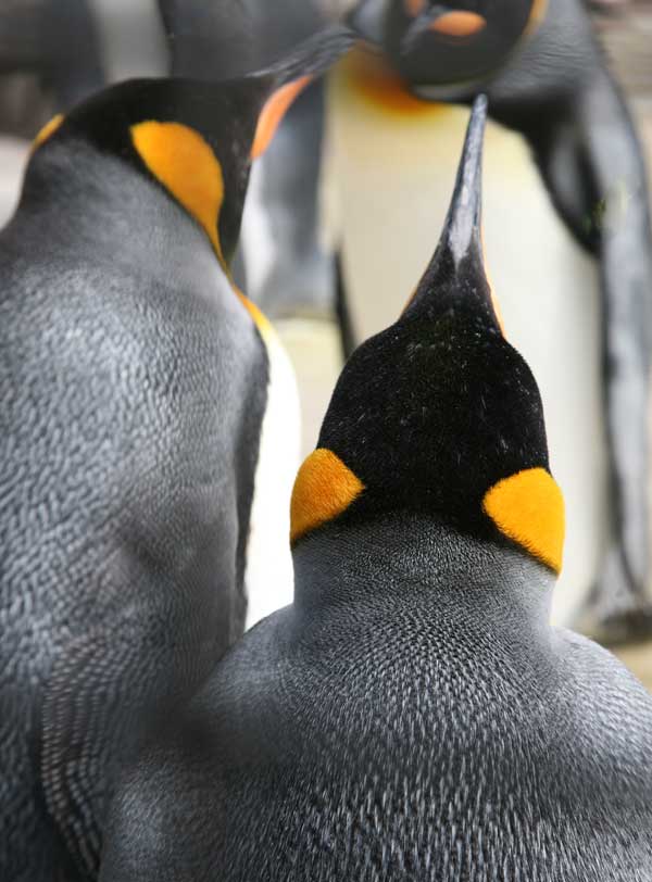 Kings are second largest of all penguins, length: 85 - 95 cm (up to 37 inches) females being generally smaller than males. Breeds twice every three years, a single egg is incubated by being held on their feet for 55 days with males and females undertaking shifts. They take up to a year to raise one chick. Different stages of their breeding cycle may be found at the same time in a rookery. They feed on small fish and some squid taken by pursuit diving.