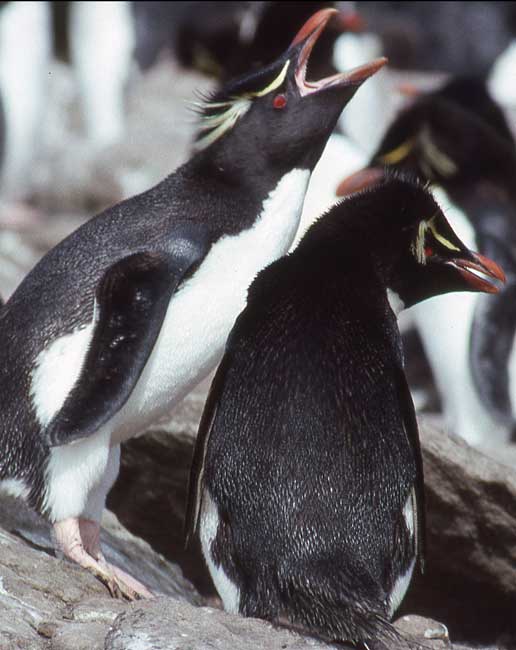 Rockhoppers are smallest of the Falkland's penguins, 45 - 55 cm (17.7 - 21.7 inches). They are a crested penguin with bright yellow plumes on either side of the head, bright red eyes and orange bill. Males are larger than females. Rockhoppers are noisy and aggressive and are usually found in huge rocky cliff-top colonies, often alongside King Cormorants. Nests are usually just depressions between rocks. Two eggs are laid, the first egg is smaller than the second. Chicks form creches about January and moult in February. By late February/ early March they leave for the sea. By mid April the adults have moulted and left the colony to return to the sea as well.