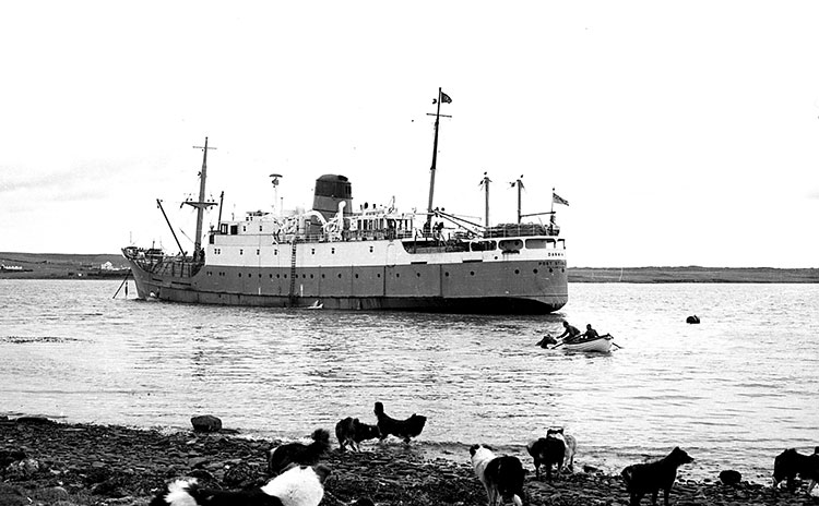 RMS Darwin replaced Fitzroy in 1957. Darwin was newly built for the Falkland Islands Company, 1793 tonnage and capable of carrying 30 passengers. She did the passenger and mail service to Montevideo (4 days journey), an annual run to South Georgia and approximately monthly round trips to the camp with mail passengers and cargo. Her high operating costs made her economically unviable and eventually in 1971 she was withdrawn and sold. In September 1973 she left Stanley for the last time. |